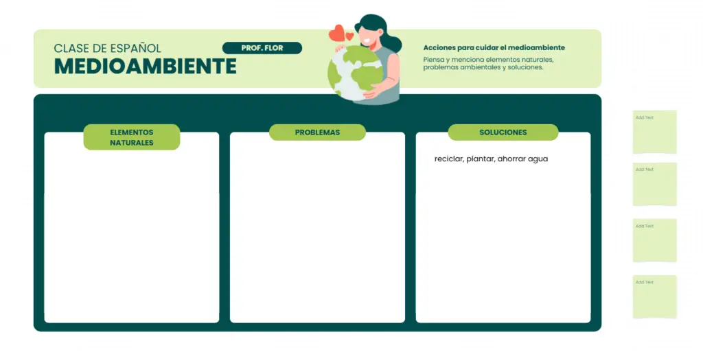 Elige un tema concreto, como problemas medioambientales o acciones sostenibles. Pide al estudiante que diga todas las palabras que recuerde relacionadas con el tema. Anótalas en una pizarra digital compartida.